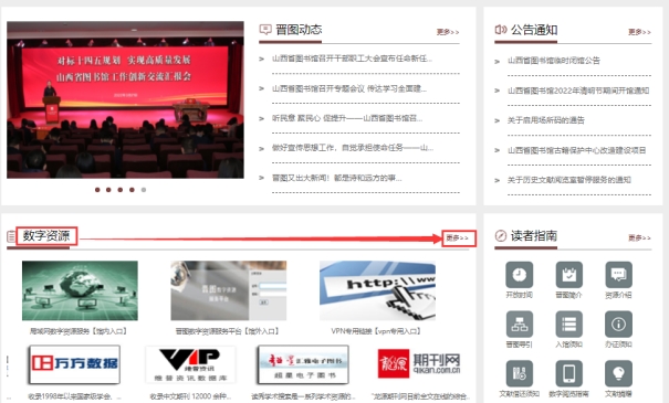 第一步:进入“山西省图书馆”官方网站,选择“数字资源—更多”。