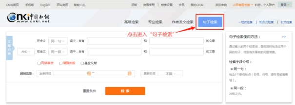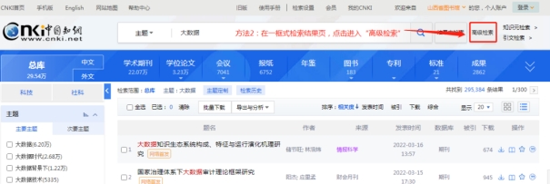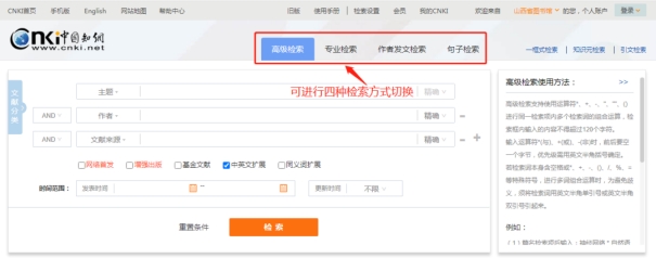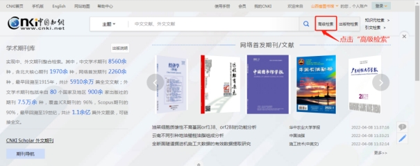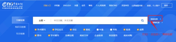 在知网首页一框式检索框右方,点击“高级检索”进入高级检索页,或在一框式检索结果页点击“高级检索”进入高级检索页。