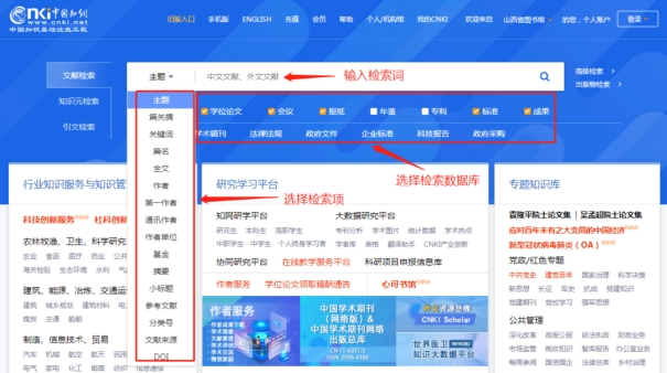 在知网首页选择检索数据库,下拉选择检索项,在检索框内输入检索词,点击检索按钮或键盘回车键,进行检索。