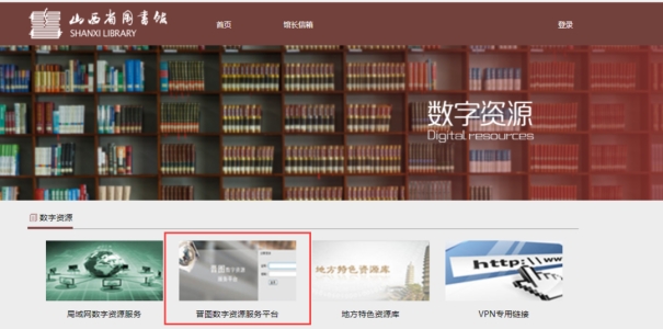 第二步:在“数字资源”模块里面选择“晋图数字资源服务平台”,使用读者证号和密码登录。