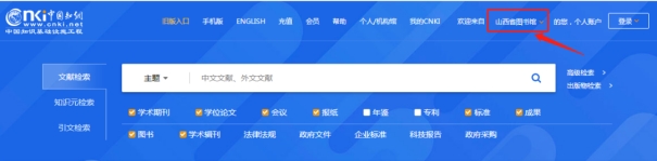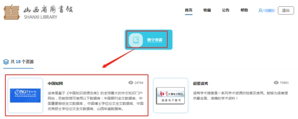 第三步:在“数字资源”模块选择“中国知网”,进入知网界面,右上角显示“山西省图书馆”则代表登录成功。