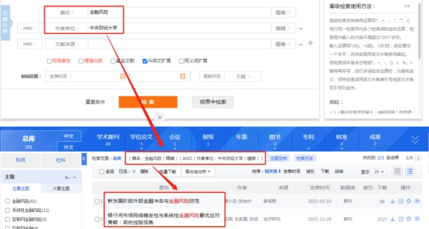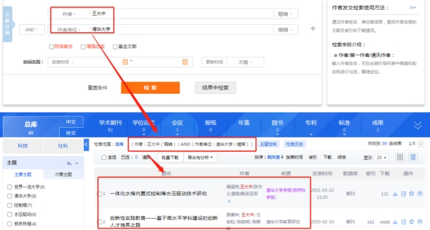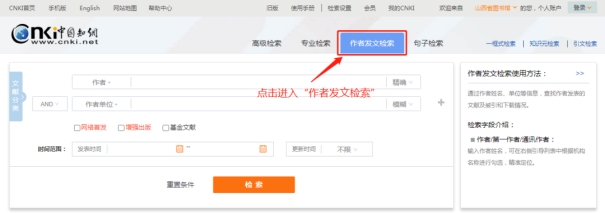 通过输入作者姓名及其单位信息,检索某作者发表的文献,功能及操作与高级检索基本相同。