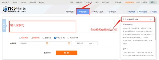 用于图书情报专业人员查新、信息分析等工作,使用运算符和检索词构造检索式进行检索。专业检索的一般流程:确定检索字段构造一般检索式,借助字段间关系运算符和检索值限定运算符可以构造复杂的检索式。