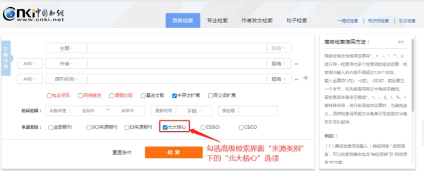 第三步:勾选高级检索界面“来源类别”下的“北大核心”选项。