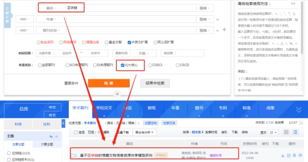 举例:检索篇名中包含“区块链”的核心期刊文献。