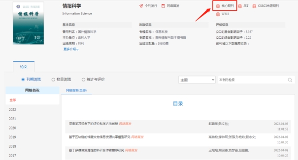 第五步:点击检索结果文献对应刊名,即可进入对应核心期刊详情页进行更多核心期刊文献查看。