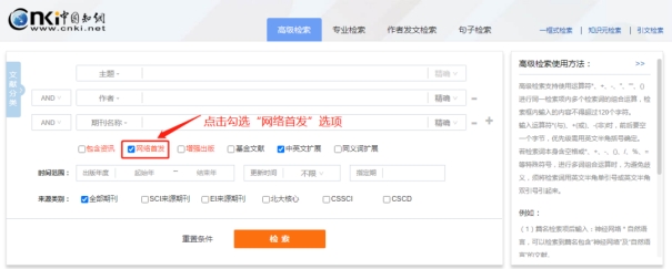 第四步:在检索区域输入检索词及检索条件进行网络首发期刊文献检索。