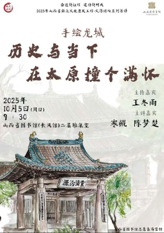 10月5日,历史科普作家寒鲲与文博手绘达人陈梦楚,将用一支笔、一卷书、一座城,带您解锁太原的“隐藏副本”,让太原的千年故事,在你手中“活”过来!