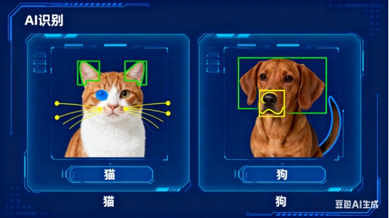 再比如,我们希望机器能够自动识别猫和狗,可以预先准备很多猫和狗的图片,分别给它们贴上猫和狗的标签,让机器去学习两种动物的差别,当学习完成后,机器就可以形成自动识别猫和狗的本领,以后再给它猫和狗的新图片,他就能正确区分猫和狗。