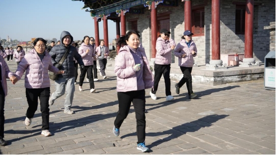 “欢乐跑”活动开始前,全体馆员集体热身,大家摩拳擦掌、跃跃欲试。副处长级干部范月珍发令枪响,大家如离弦之箭冲向前方,尽情挥洒着汗水与欢笑。