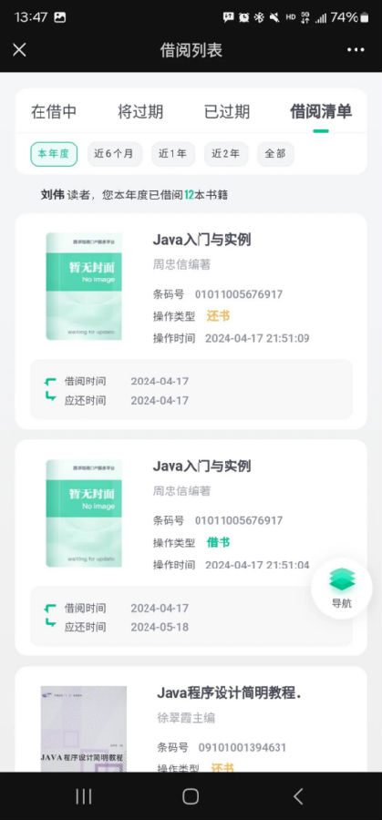 一目了然查看您的借阅历史,掌握在借中、即将到期、已过期的图书。