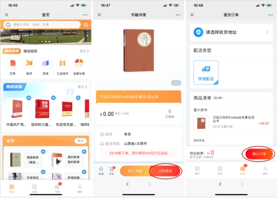 进入“选书”页面,您可以在商城里选择自己喜欢的图书,也可以在搜索框内输入您想看的图书名称或者喜欢的作者的名字,选好想要购买的图书,点击“立即借阅”,最后确认订单就可以了。