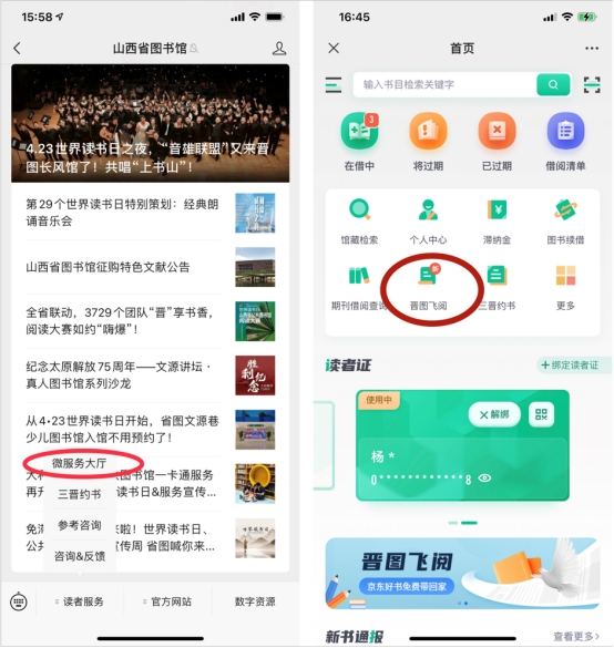 打开微信→搜索、关注“山西省图书馆”服务号→点击 “读者服务”→点击“微服务大厅”→点击“晋图飞阅”, 进入选书页面。