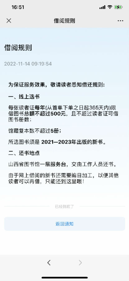 在选书页面右上角有一个方形的小图标,您点击进去就可以查看到详细的借阅规则了!
